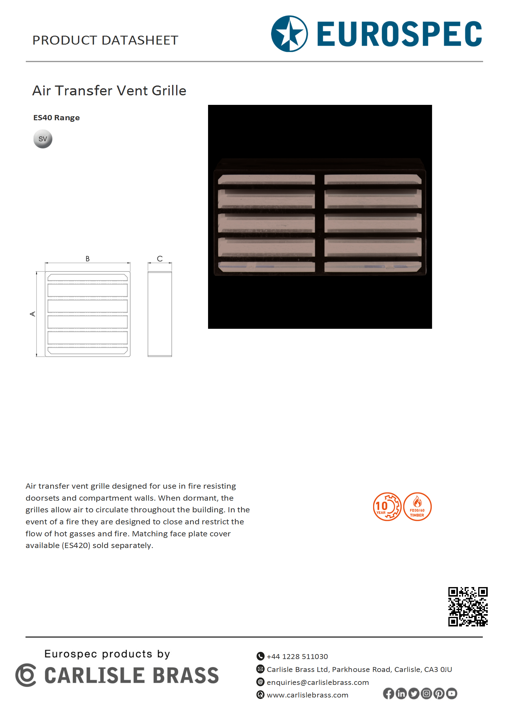 Air transfer vent grille designed for use in fire resisting doorsets and compartment walls. When dormant, the grilles allow air to circulate throughout the building. In the event of a fire they are designed to close and restrict the flow of hot gasses and fire. Matching face plate cover available (ES420) sold separately. All air transfer grille systems are tested to BS476 part 20/part22:1987 – 30 and 60 minute fire rated. Comes with a 10 year mechanical guarantee. Suitable for all domestic, commercial and industrial use. Available in different sizes